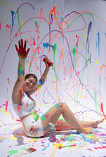 בסט הזה תיכננתי שיהיה רקע לבן ובגדים לבנים אבל שהיו המון צבעים על כל הבגדים והרקע ימשכו את כל תשומת הלב אליהם. בהתחלה המחשבה הייתה לעשות גרפיטי אבל בסוף החלטתי להשתמש בצבעי גואש מכיוון שהרגשתי שהשימוש בהם (לשפוך ולהשפריץ) על הרקע ועל הדוגמנית והבגדים הלבנים מעניין יותר ומיוחד יותר.